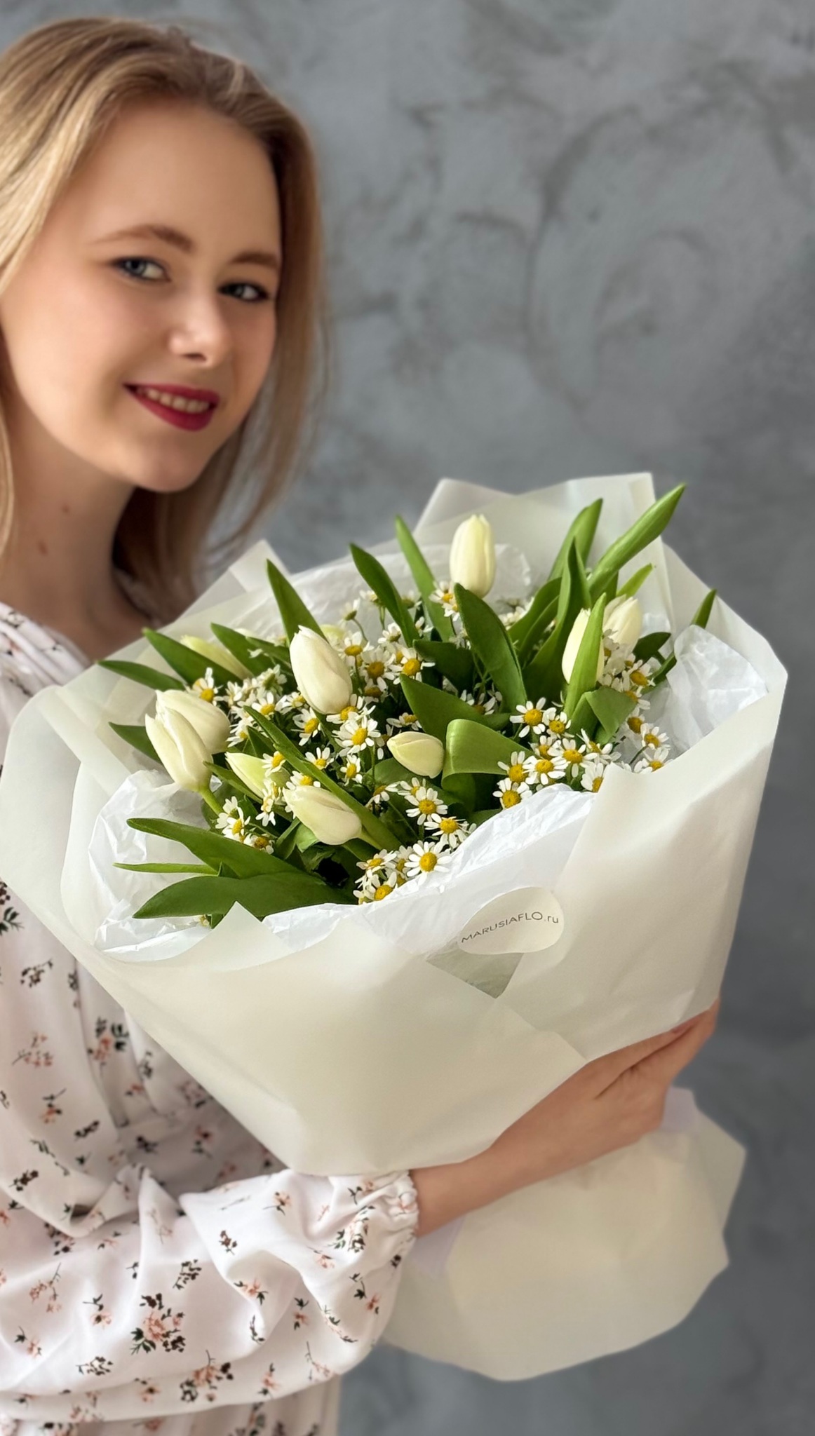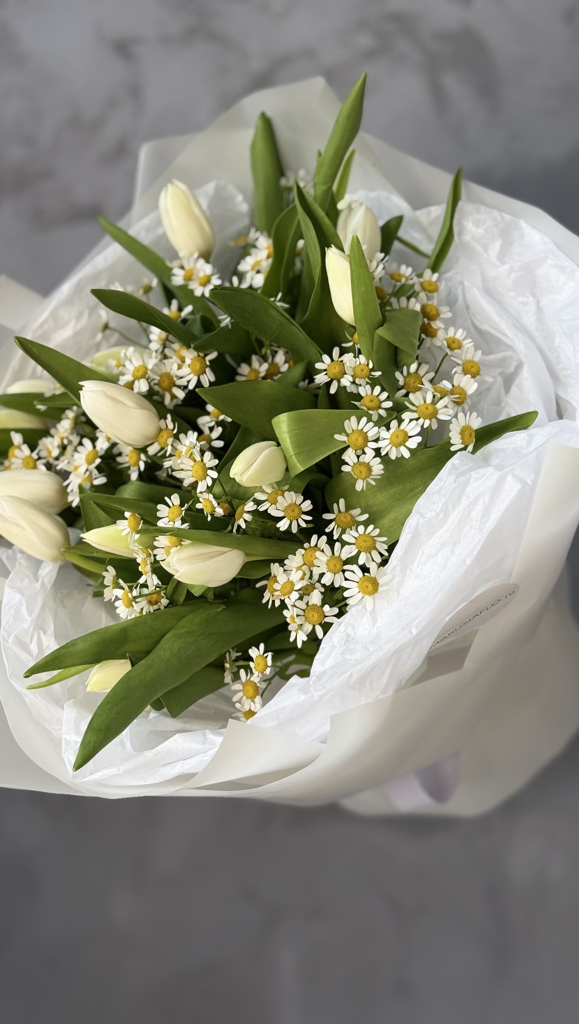Белоснежные тюльпаны с ромашкой