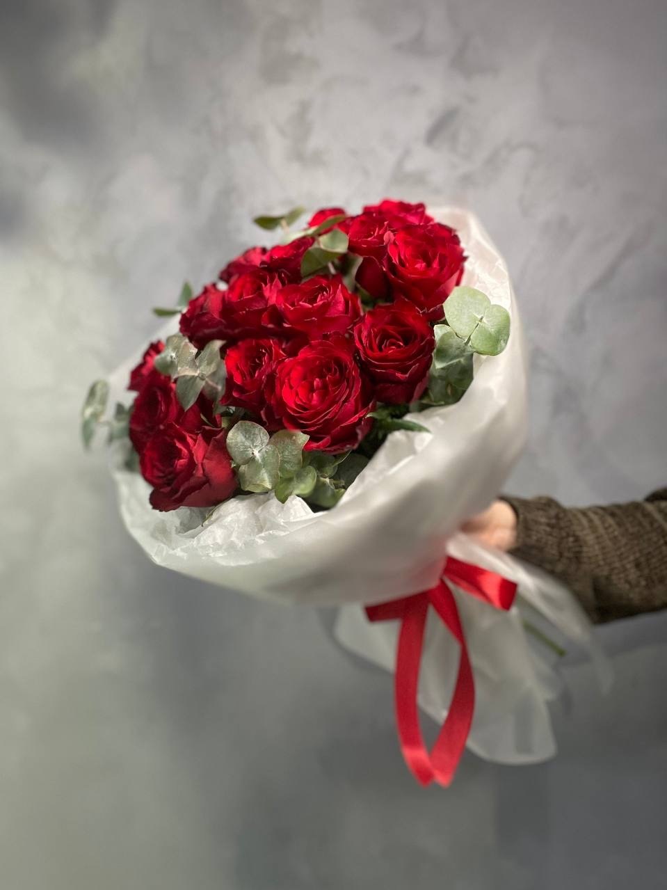Букет 15 роз с эвкалиптом в оформление.